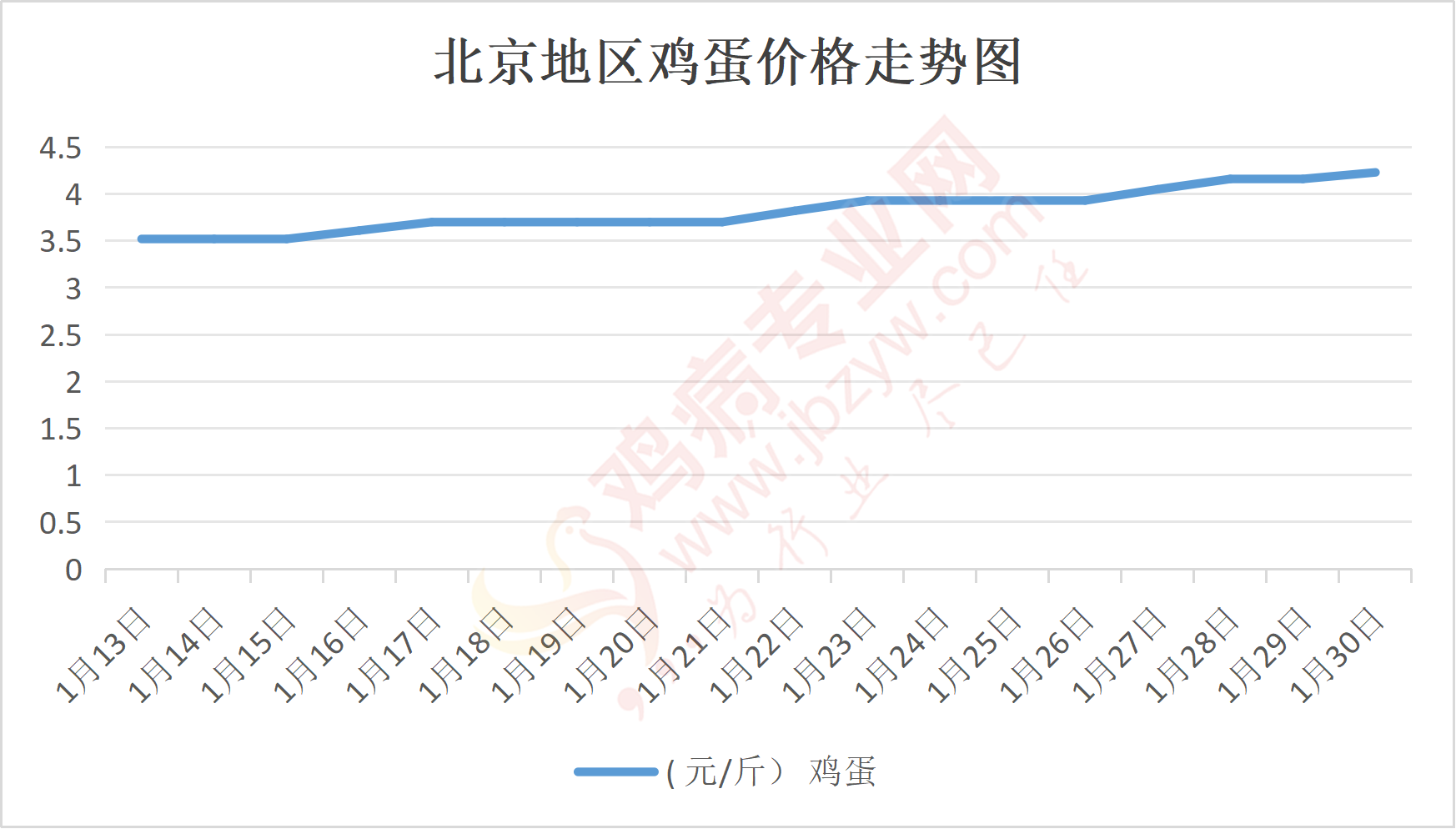 鸡病专业网消息:1月30日,北京大洋路鸡蛋主流批发价格186-187元/44斤,涨,到货4台车,成交灵活,走货一般;回龙观鸡蛋186元/44斤,涨;顺义石门鸡蛋186元/44斤,涨。