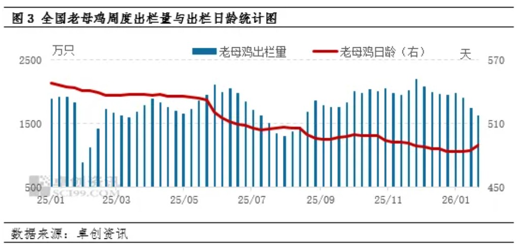 淘汰端,养殖单位惜售延淘情绪浓厚,2026年1月份老母鸡出栏量持续下降,1月第三周全国老母鸡周度出栏量下降至1627万只,较12月最后一周降幅17%左右,淘汰日龄延后至490天左右。补栏情况也一改前期低迷状态,年后补栏订单增加带动鸡苗价格回升,多数地区鸡苗价格上涨至3.0-3.5元/羽,较12月低点上涨超20%。养殖端心态的改变,将为去产能节奏增添变数。