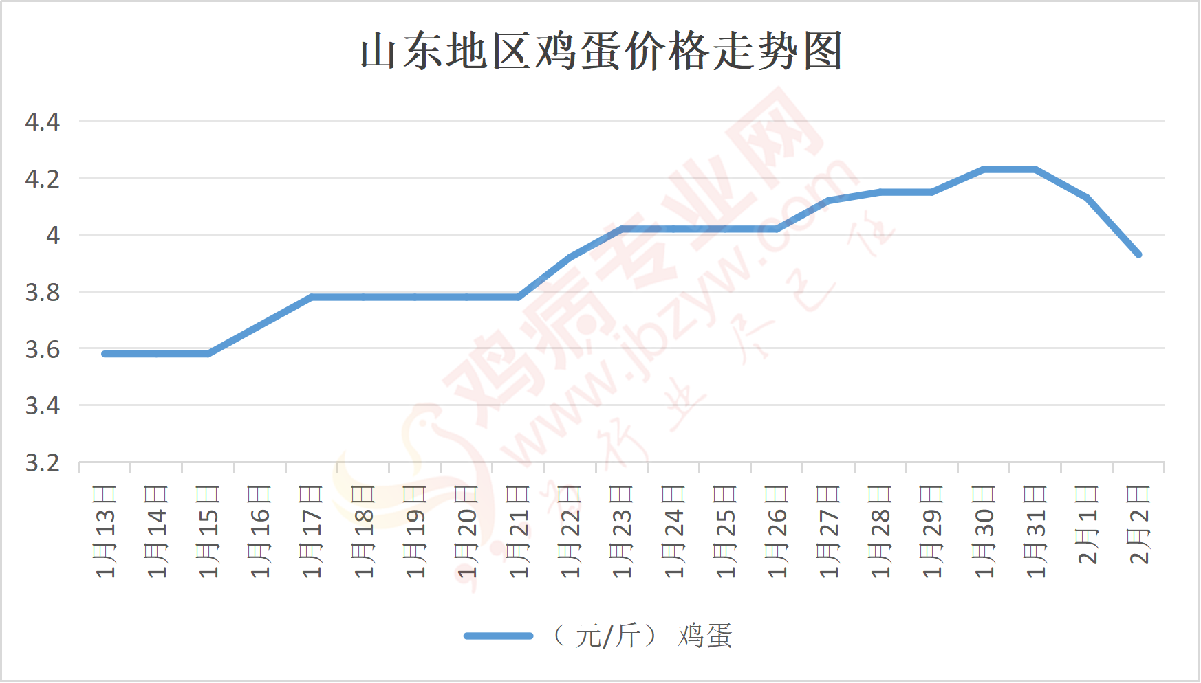 鸡病专业网消息:2月2日,山东地区莱阳鸡蛋3.9元/斤,落;青岛鸡蛋3.9元/斤,落;诸城鸡蛋4.05元/斤,落;安丘鸡蛋3.9元/斤,落;昌乐鸡蛋3.9元/斤,落;寿光鸡蛋3.9元/斤,落;昌邑鸡蛋3.9元/斤,落;高密鸡蛋4.05元/斤,落;青州鸡蛋3.9元/斤,落;临朐鸡蛋3.9元/斤,落;莱州鸡蛋3.9元/斤,落;威海鸡蛋3.9元/斤,落;临沭鸡蛋3.8元/斤,落;沂水鸡蛋3.8元/斤,落;沂南鸡蛋3.8元/斤,落;莒南鸡蛋3.8元/斤,落;兰陵县鸡蛋3.8元/斤,落;日照鸡蛋3.8元/斤,落;莒县鸡蛋3.8元/斤,落;日照辛萁商贸鸡蛋3.8元/斤,落;泗水鸡蛋价格115元/30斤,落;济宁、汶上鸡蛋价格115元/30斤,落;梁山、东平红蛋价格115元/30斤,落;枣庄滕州地区鸡蛋混码主流到户116元/30斤,落;泰安地区新泰鸡蛋价格115元/30斤,落;菏泽地区曹县主流到户115元/30斤,落;成武鸡蛋价格115元/30斤,落;单县到户115元/30斤,落;聊城莘县115元/30斤,落;莱芜鸡蛋171元/45斤,落;济南鸡蛋171元/45斤,落;德州鸡蛋150元/40斤,落;滨州鸡蛋150元/40斤,落。