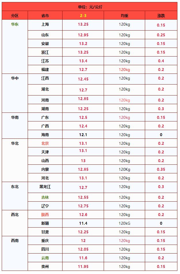 | 华南 | 广东省 | 13.00 | 12.97 | 0.23% | 元/KG |