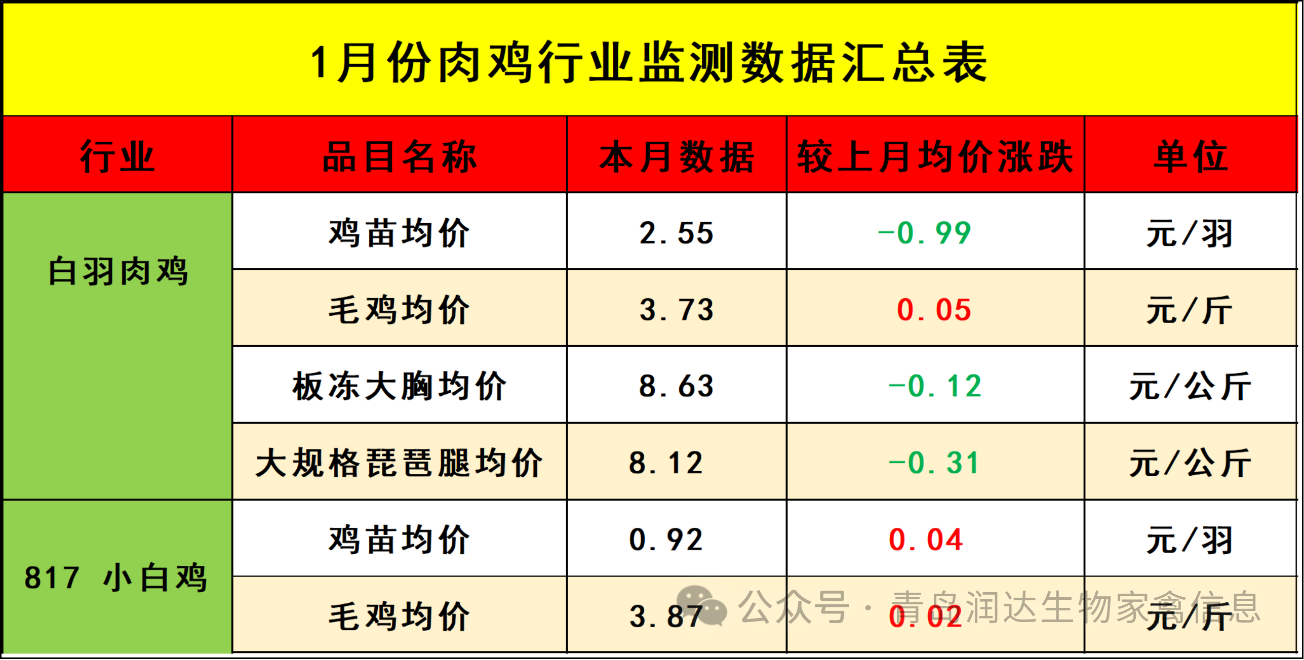 1月肉鸡均价呈先降后涨走势,1月上中旬毛鸡供应相对充足,产品走货一般,企业收购积极性不高,供需利空下,鸡价高位小降;下旬鸡病情况加重,山东等区域肉鸡死淘率加重,出栏小鸡情况多见,前期鸡源提前出栏透支后续鸡源供应,企业收购难度提升,产品端临近春节假期,走货顺畅,企业收购积极性随之提升,供需提振下,毛鸡价格持续上涨至月内高位,且月底山东等地区毛鸡实际收购过程中仍有加价操作,月下旬鸡价超预期上涨,进一步拉动月内毛鸡均价环比上行。