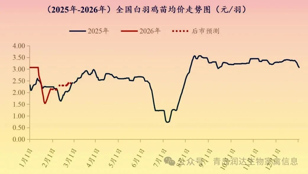 1月国内白羽肉鸡苗价格呈先跌后涨走势,月均价环比下跌。上旬孵化场多暂停出苗,市场几无成交,无主流成交价格,苗价延续2025年12月底的鸡苗成交价格;中旬孵化场陆续恢复出苗,鸡苗供应量低位增加,但养殖户多担忧后期出栏毛鸡时屠宰场暂未开工,补栏积极性不高,且议价情绪较重,孵化场排苗压力较大,临时计划量增多,鸡苗价格承压下跌;下旬孵化场出苗量处于高位,但由于毛鸡价格上涨,对鸡苗市场有提振作用,加之此时补栏鸡苗待毛鸡出栏时屠宰场陆续开工,因此中大型养殖场整体补栏积极性提升,孵化场排苗较为顺畅,推动鸡苗价格上涨。