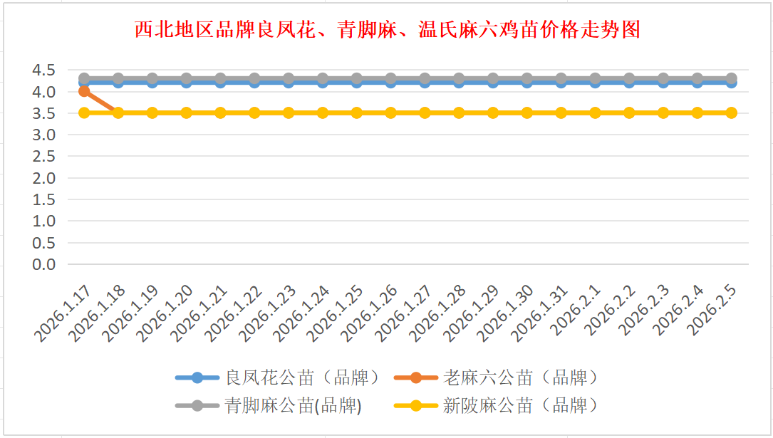 品牌青脚麻公苗(多品种快大型):价格稳定,到户价4.30元/羽,稳。