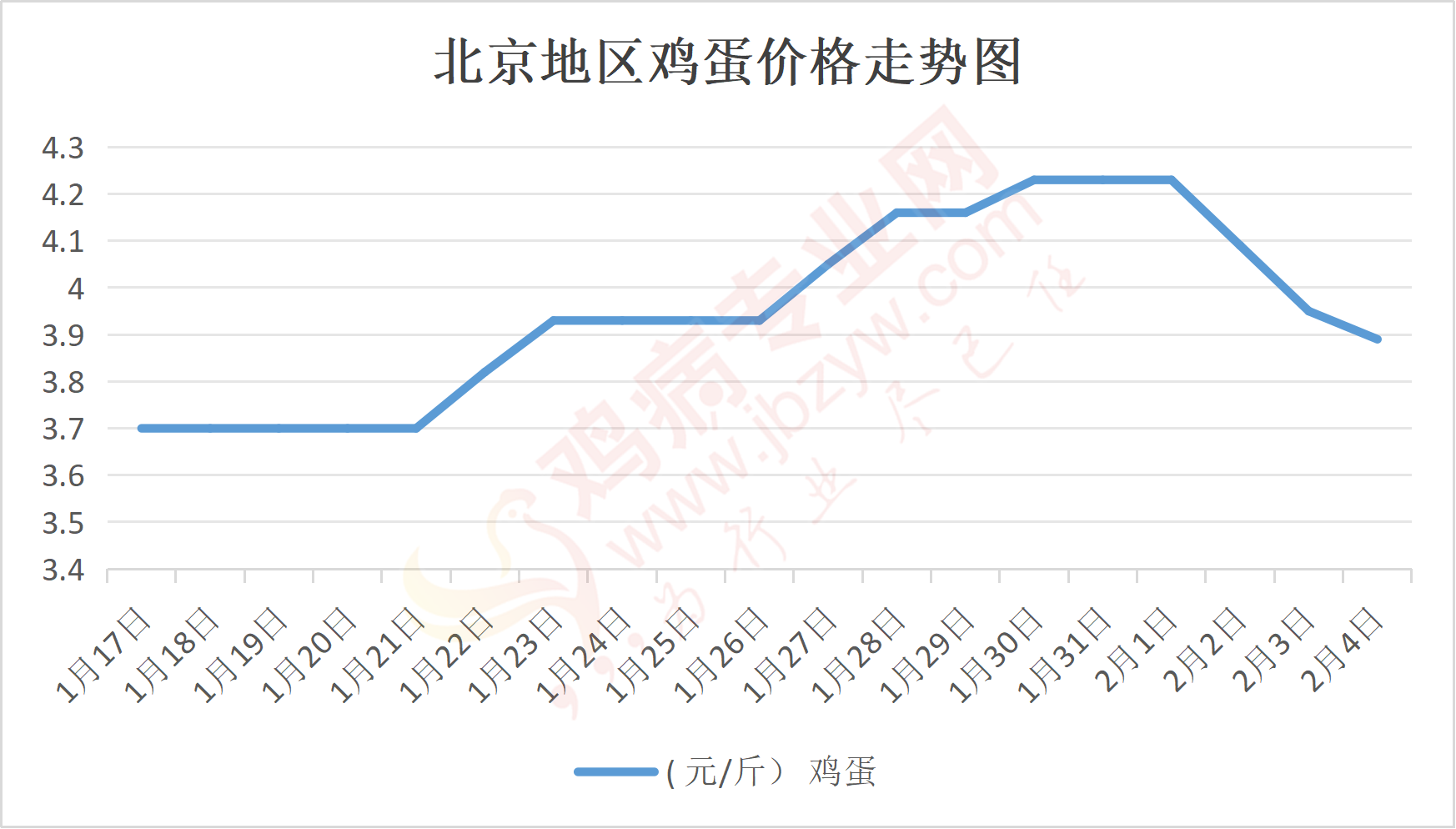鸡病专业网消息:2月4日,北京大洋路鸡蛋主流批发价格171-172元/44斤,落,到货4台车,成交灵活,走货偏慢;回龙观鸡蛋171元/44斤,落;顺义石门鸡蛋171元/44斤,落。
