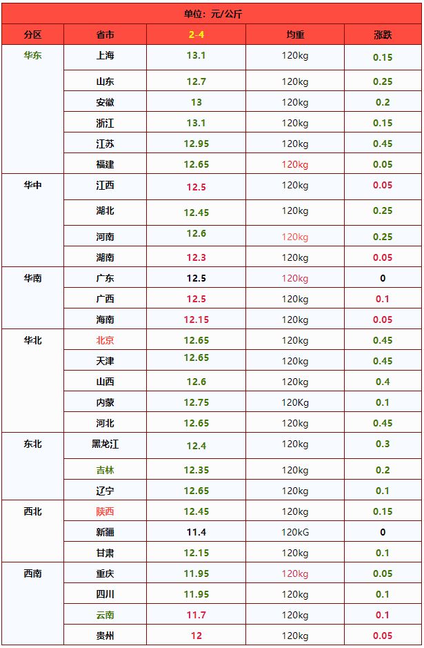 | 华南 | 广东省 | 12.98 | 12.82 | 1.26% | 元/KG |
