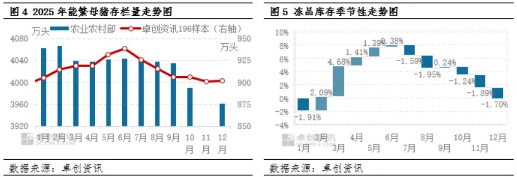 2025年全国白条猪肉价格处于近五年低位水平,且年内价格震荡下滑,波动幅度偏小。这主要是由于年内屠宰量增幅大于体重降幅,猪肉产量同比增加导致。2026年根据能繁母猪存栏量数据变化,猪肉产量或先增后减,因此猪肉价格或先跌后涨,但产量仍或较为充足,且冻品出入库或平抑价格波动,因此年均价或同比下滑,且幅度收窄。