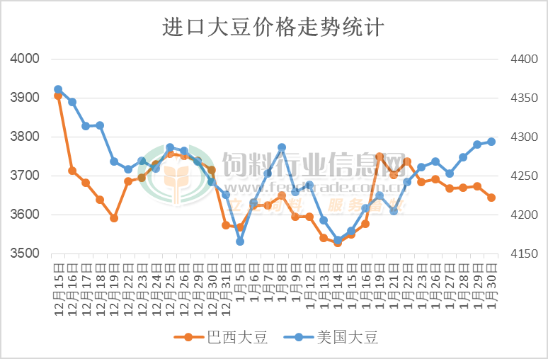 受美盘大豆价格上行影响,进口大豆价格整体维持偏强上涨的走势。其中进口美国大豆价格因其销售良好且阿根廷减产预期支撑其上行,从4160元/吨震荡偏强上行至4290元/吨,涨幅在130元/吨。而巴西大豆价格亦出现上涨,特别是在1月中旬最高涨至3750元/吨高位,上涨220元/吨,但随着后期收割持续开展且丰产预期强劲,进口巴西大豆价格出现一定的回调,下跌110元/吨。预计随着巴西大豆收割工作持续展开,季节性供应压力逐渐增大后大豆价格将继续偏弱运行。