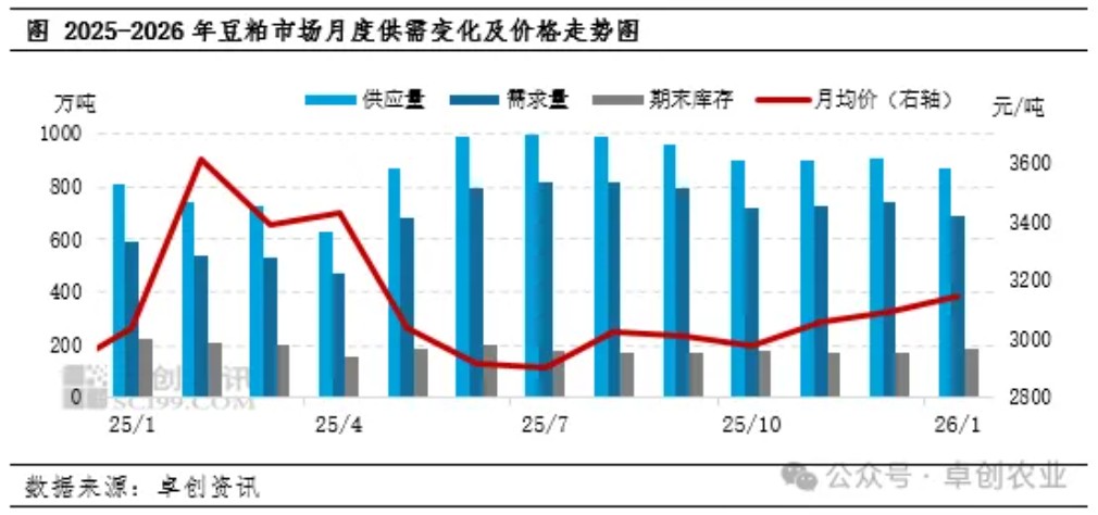 供应预期:原料大豆供应呈现季节性回落,工厂春节期间停机,企业开工负荷降至年内低位水平。首先,原料方面,根据卓创资讯对大豆到港预估以及国内压榨企业开停机情况调研显示2026年2月-4月大豆到港预计分别为490万吨、500万吨、1000万吨,大豆到港量呈现季节性下滑,走势呈现先紧后松。开机方面:受节日效应影响,春节期间多数企业均有停机计划,2月份生产企业开工负荷率或降至年内最低水平。结合当前国内生产企业原料大豆及豆粕库存情况,截至2026年1月30日当周,国内重点生产企业原料大豆库存613.8万吨,豆粕库存89.8万吨,均处于历史同期高位水平。春节前后国储拍卖进口大豆工作或恢复进行,一定程度上补充市场原料供应。综合来看,2月份原料端有收紧预期,但现货市场宽松格局或限制豆粕价格上涨空间。