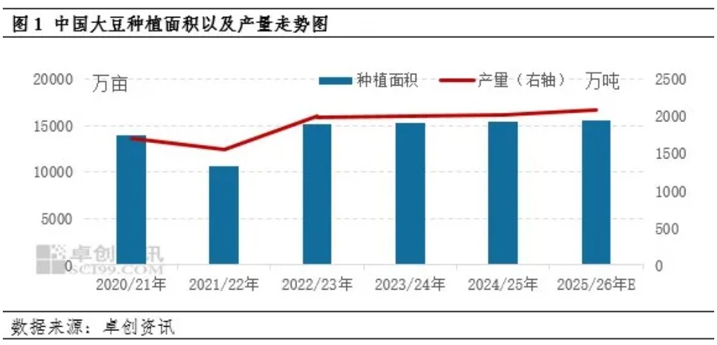 2026年是“十五五”开局之年,作为开局之年的一号文件,开篇的首要任务指出要稳定发展粮油生产。对于大豆市场来说,文件指出要巩固提升大豆产能,做好产销衔接。卓创资讯数据显示,近五年度中国大豆面积及产量呈现震荡增加趋势,产量从2020/21年度的1697万吨增至2024/25年度的2020万吨,平均增长率7.47%。未来大豆产能的继续增加,在国内耕地面积较为紧张的背景下,单产的增加将是产量增加的主要方向。文件提及,推进粮油作物大面积提单产,推动粮食品种培优和品质提升。以东北产区为例,今年高蛋白优质品种增多,高油、低蛋白品种面积产量增加,主要品种包括绥农76、88,蛋白在44%左右。
