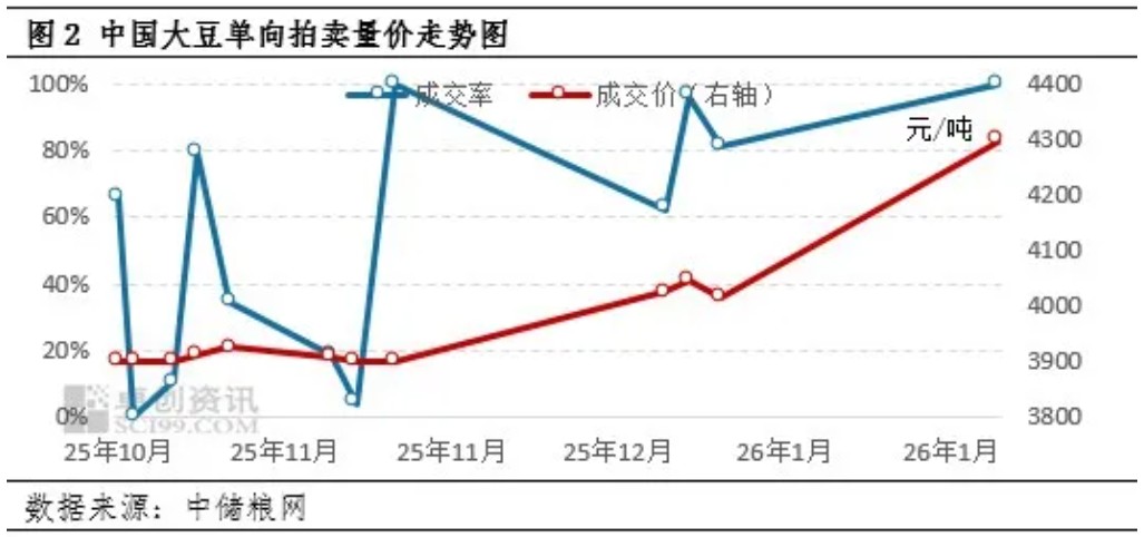 2025年农民增收部分融于各部分部署章节,2026年首次将“积极促进农民稳定增收”设为独立章节,与粮食安全并列核心目标。从保护和调动农民务农种粮积极性、培育壮大县域富民产业、促进农民工稳岗就业三个方面进行系统施策。对于大豆市场来说,补贴政策是影响种植积极性和产量的重要因素,国储拍卖价格是影响市场价格和供需预期的重要举措。2025年,黑龙江大豆生产者补贴350.73元/亩,吉林生产者补贴分区域在410元/亩至550元/亩,辽宁生产者补贴在410元/亩至460元/亩。大豆补贴显著高于玉米,优质品种叠加奖补,引导扩种与品质提升。从收购价格看,2025年新豆上市以来,国储收购价格震荡走高,对市场情绪起到积极影响。卓创资讯数据统计,中储粮网的国产大豆单向拍卖的成交价格,从25年10月的3900元/吨上涨至26年2月的4298元/吨,不断上调的成交价格,对于农民的增收起到积极影响。