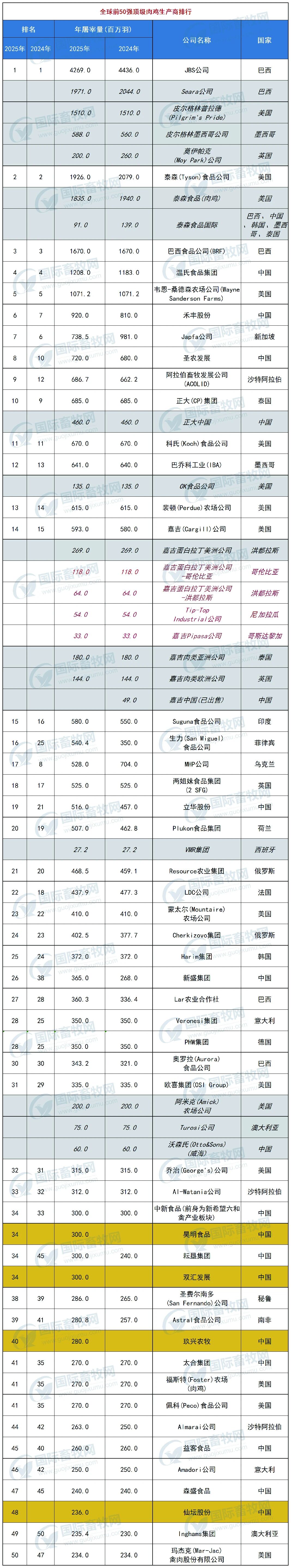 2025年全球顶级肉鸡企业50强公布:中国温氏、禾丰、圣农、正大、立华、昊明等上榜