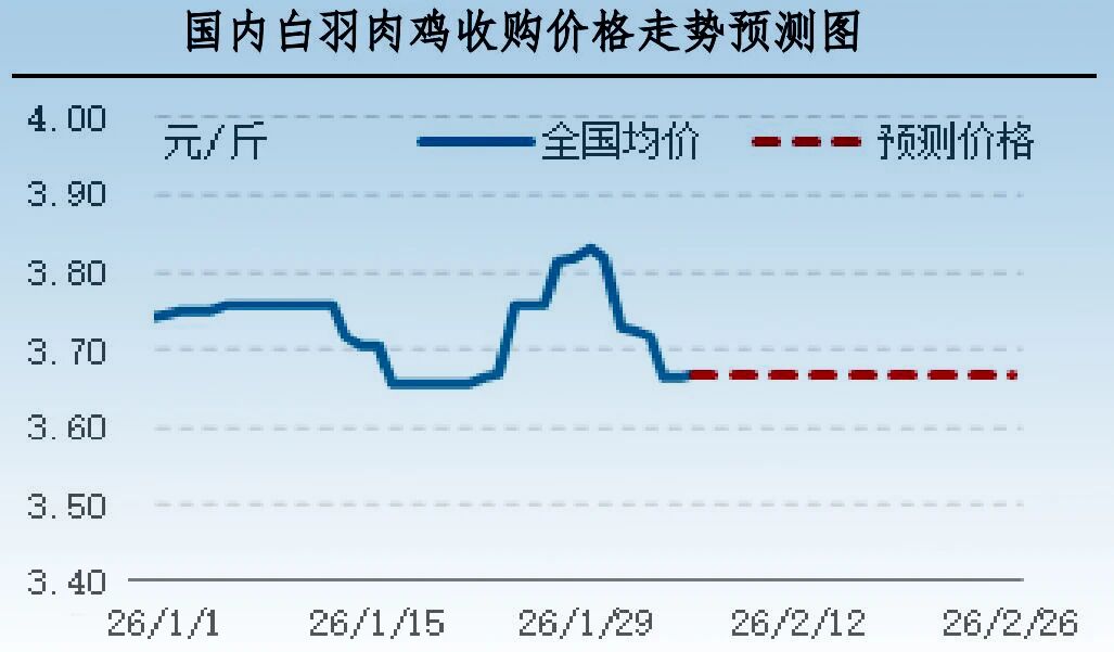 2月12日(腊月二十五日)以后,多数企业陆续放假,市场或多处无价无市状态,价格延续前期收盘价格。节后正月初七(2月23日)开始,企业陆续恢复生产,但节后企业复工企业宰杀量有限,叠加鸡源供应不多,供需两淡,鸡价或延续前期收盘价格。预计未来三周鸡价或走稳。