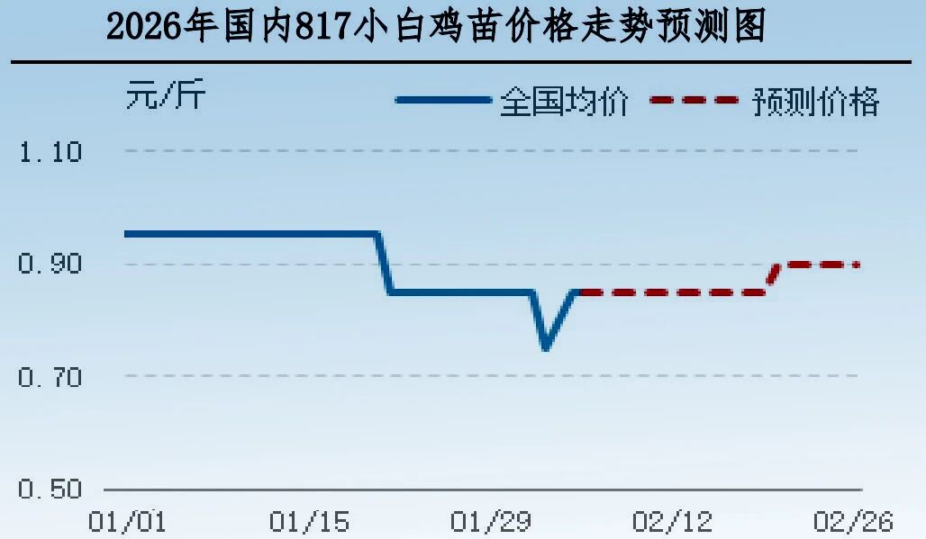 817小白鸡鸡苗:短期鸡苗供应量或进一步减少,但毛鸡市场运行不佳,养殖端补栏积极性平淡,短期鸡苗价格或低位持稳,预计下周鸡苗均价环比微涨。中旬进入春节假期,苗市处供需两淡状态,苗价或延续;节后养殖端补栏心态或稍有提升,市场苗量不大,届时苗价或上涨。预计未来三周817小白鸡苗价格呈先稳后涨走势。
