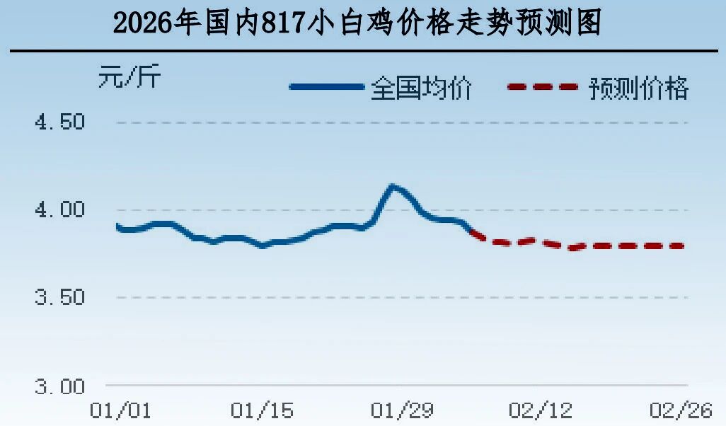 817小白鸡:短期产品走货速度不快,屠宰企业收购热情不高,养殖端面对下行行情出栏积极性提升,毛鸡价格反弹上行难度较大,预计下周毛鸡市场交投偏弱,毛鸡均价环比下跌。中旬市场逐渐进入春节假期,市场交投量减少,毛鸡价格或延续;节后市场供需两淡,毛鸡价格或延续偏弱震荡态势。(密切关注替代品价格以及气温变化)