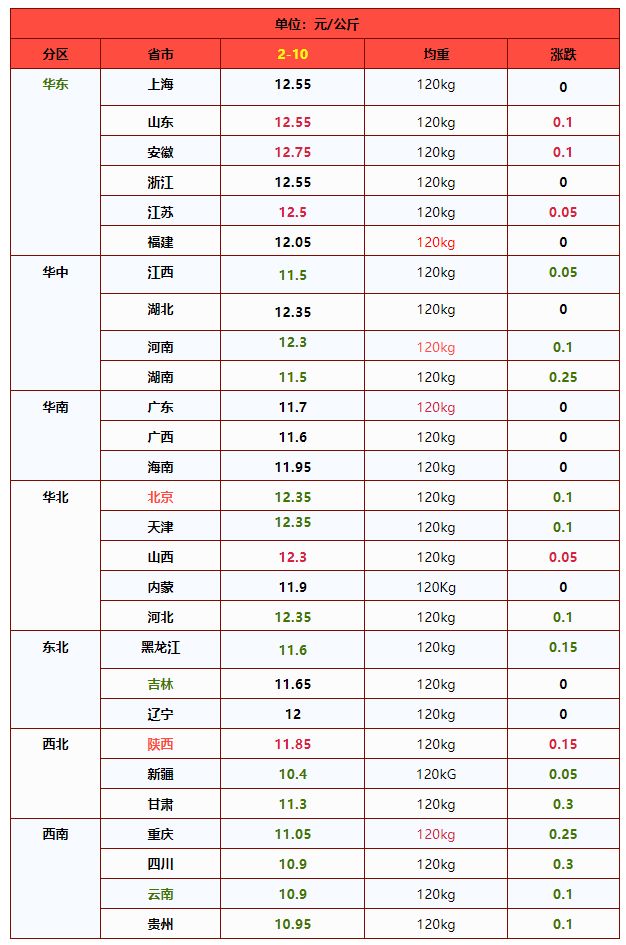 | 西北 | 陕西省 | 11.58 | 11.62 | -0.34% | 元/KG |