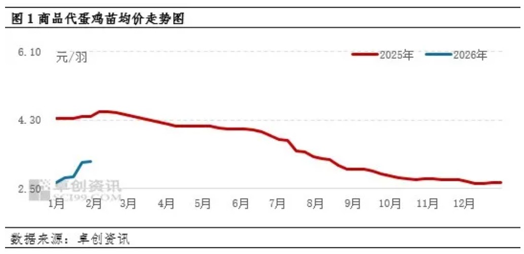 1月份受鸡蛋价格上涨影响,蛋鸡养殖盈利状况明显改善,成功实现扭亏为盈。据卓创资讯监测数据显示,1月平均单斤鸡蛋养殖利润0.27元,较2025年12月扩大0.47元,盈利水平显著扩大,提振了行业信心。养殖单位补栏心态好转,补栏积极性提升,鸡苗需求量增加,拉动鸡苗价格上涨。据卓创资讯监测数据显示,1月商品代蛋鸡苗均价3.01元/羽,环比涨幅13.58%,显示出苗价在需求拉动下呈现较强的上涨动力。