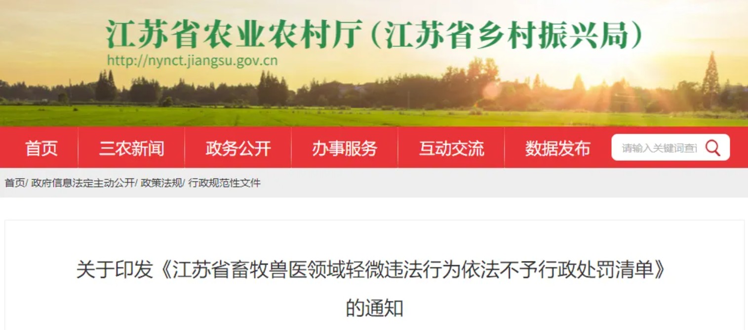 近日,江苏省农业农村厅正式印发《江苏省畜牧兽医领域轻微违法行为依法不予行政处罚清单》(以下简称《不予处罚清单》),同步发布相关实施通知,明确多项与宠物医疗行业密切相关的轻微违法行为,在满足特定条件下可依法不予行政处罚。