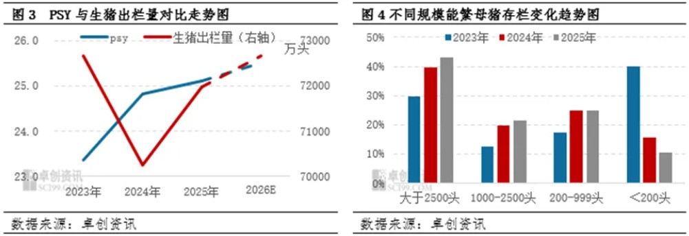 综上,2025年末能繁母猪存栏量虽明显下滑,但因减产群体中中小场及散户居多,规模场较少,一方面导致规模场占比提升,另一方面带动产效提升,2026年供应或仍过剩。未来调控产能政策或继续推行,母猪数量或继续下滑,而2026年产能过剩、养殖亏损或推动自然减产亦加速进行。规模企业成本调控到位或可穿过亏损周期,而大猪供应缺口扩大或推动中小规模场及散户转型为大猪的主要养殖群体,以此保证穿过亏损周期。