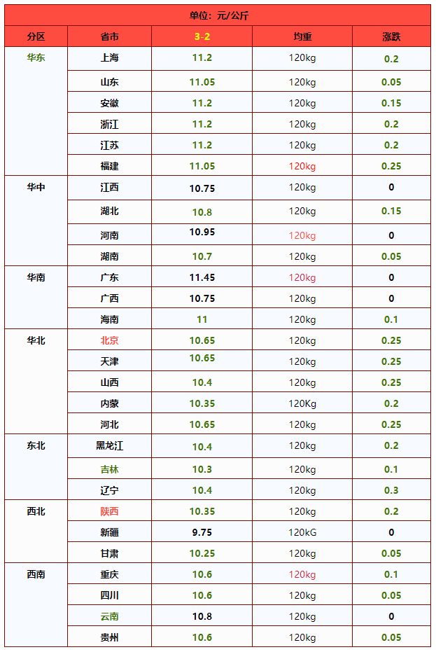 | 华中 | 河南省 | 11.03 | 10.97 | 0.54% | 元/KG |