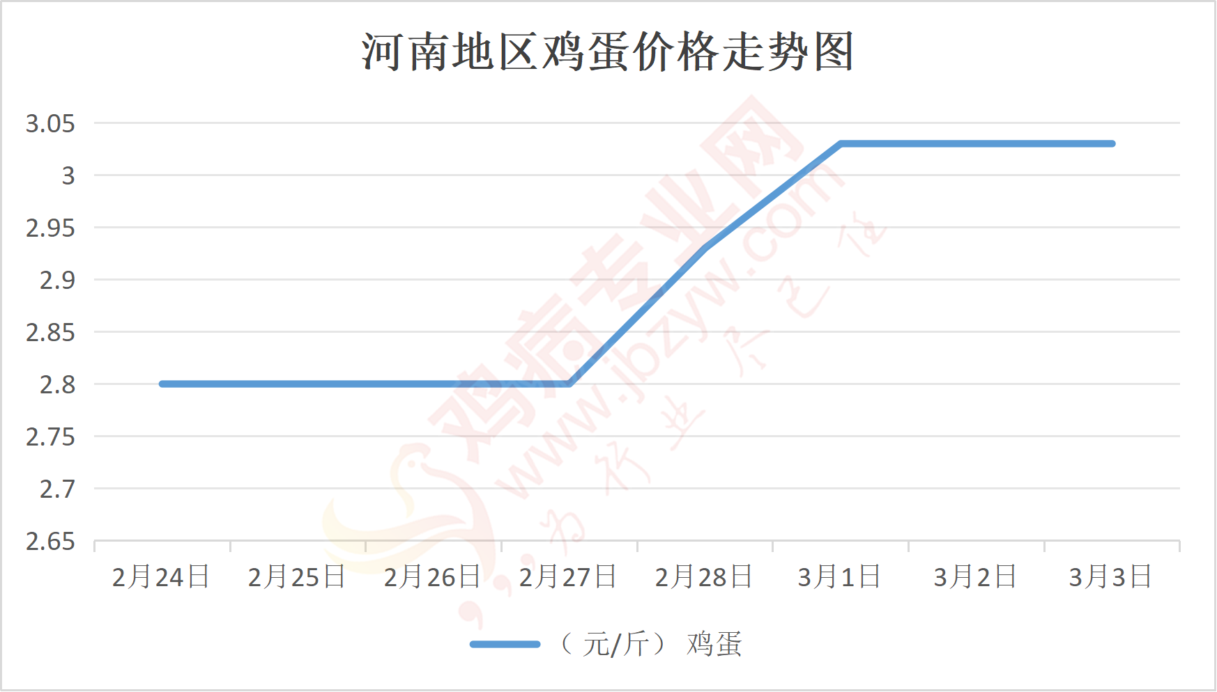 鸡病专业网消息:3月3日,河南郑州鸡蛋3.05元/斤,稳;新密鸡蛋3.05元/斤,稳;荥阳鸡蛋3.05元/斤,稳;中牟鸡蛋3.05元/斤,稳;周口鸡蛋3元/斤,稳;商丘鸡蛋91元/30斤,稳;鹤壁鸡蛋2.95元/斤,稳;汝州鸡蛋3元/斤,稳;开封鸡蛋91元/30斤,稳;漯河鸡蛋3元/斤,稳;漯河临颍鸡蛋3元/斤,稳;许昌鸡蛋3元/斤,稳;南阳鸡蛋3元/斤,稳;南阳邓州鸡蛋3元/斤,稳;新乡鸡蛋3元/斤,稳;安阳鸡蛋3元/斤,稳;新郑鸡蛋3.05元/斤,稳;登封鸡蛋3.05元/斤,稳;平顶山鸡蛋3元/斤,稳;驻马店鸡蛋3元/斤,稳;三门峡鸡蛋3元/斤,稳;焦作鸡蛋3元/斤,稳;信阳鸡蛋3元/斤,稳;濮阳鸡蛋3元/斤,稳。