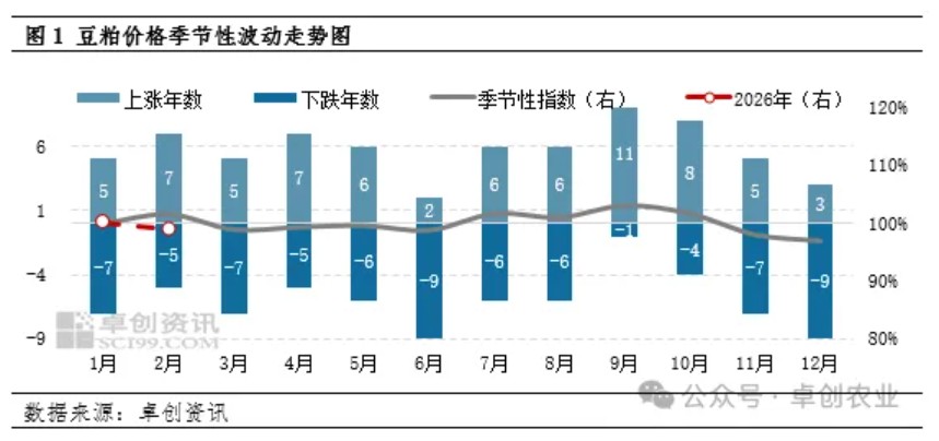 节后首个交易日,豆粕主力合约M2605收盘报2781元/吨,下跌19元/吨。(来源:大商所)现货均价交节前上涨5元/吨,收于3135元/吨,现货基差价格小幅走强。多数贸易商报价较节前小涨,午后市场有压价情况,成交价格走弱。截至2月24日,卓创资讯统计2月豆粕现货均价为3117.62元/吨,环比跌0.92%,同比跌13.66%。根据卓创资讯统计过去12年豆粕价格季节性波动特点来看,2月份豆粕价格上涨概率大于下跌概率,2026年2月走出反季节性规律。主要原因在于市场供应端现实与预期均处于宽松格局,施压价格整体表现疲软。