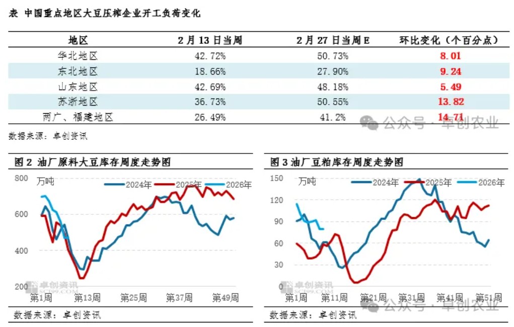 卓创资讯认为,当前国内豆粕市场核心矛盾集中在高供应与弱需求两端。一方面,油厂开机率正逐步恢复,前期原料储备充足,叠加节后大豆到港预期增加,市场供应端压力持续显现;另一方面,下游饲料企业节前物理库存偏高,节后消化库存为主,零星刚需补库,叠加养殖端需求恢复缓慢,难以对价格形成有效拉动。在企业库存高位运行、供应宽松格局不变的背景下,预计3月上半月国内豆粕价格弱势下跌为主,短期难有明显反弹动力。