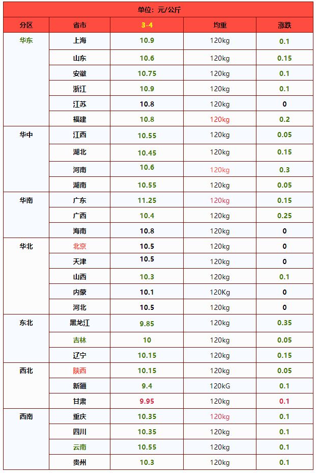 | 华北 | 北 京 | 10.53 | 10.56 | -0.28% | 元/KG |