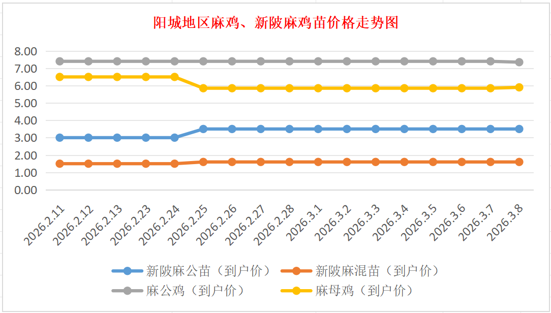 麻鸡成鸡:价格稳定,麻公鸡棚前出栏价7.30-7.50元/斤左右(5.8斤以上),麻母鸡棚前出栏价5.70-6.00元/斤(5斤以上),稳。