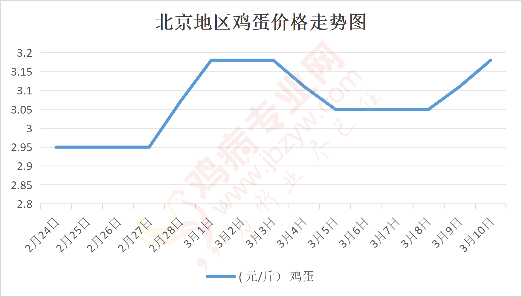 鸡病专业网消息:3月10日,北京各大市场鸡蛋价格上涨3元,主流参考价140元/44斤,石门,新发地、回龙观等主流批发价140元/44斤,涨;大洋路鸡蛋主流批发价格140元/44斤,涨,按质高低价均有,到车8台,到货正常,成交灵活,走货一般。
