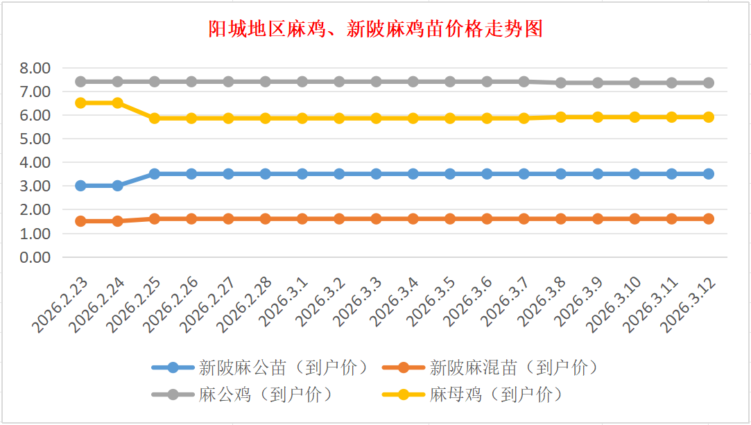 麻鸡成鸡:价格稳定,麻公鸡棚前出栏价7.30-7.50元/斤左右(5.8斤以上),麻母鸡棚前出栏价5.70-6.00元/斤(5斤以上),稳。