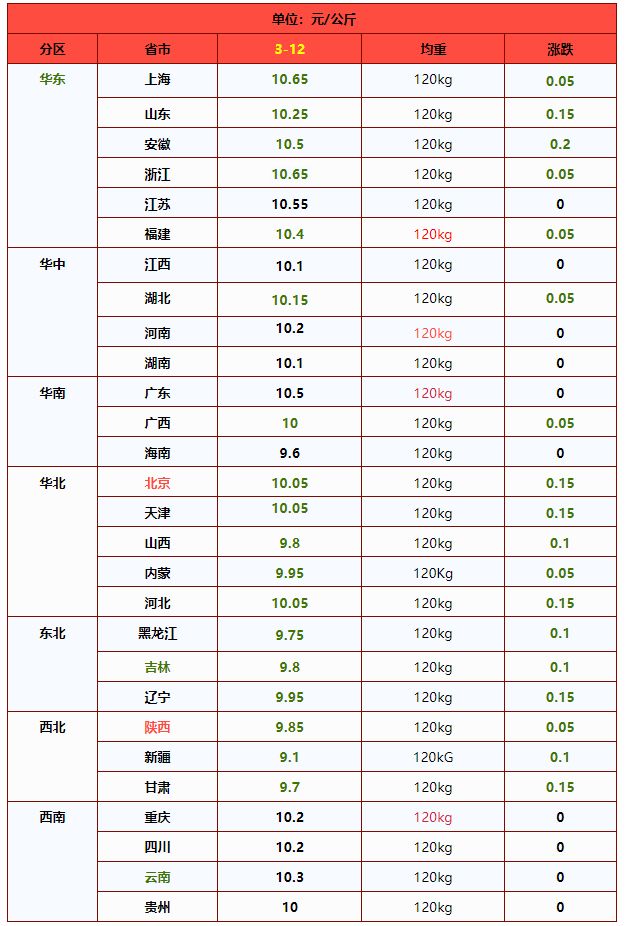 | 华北 | 北 京 | 10.31 | 10.39 | -0.77% | 元/KG |