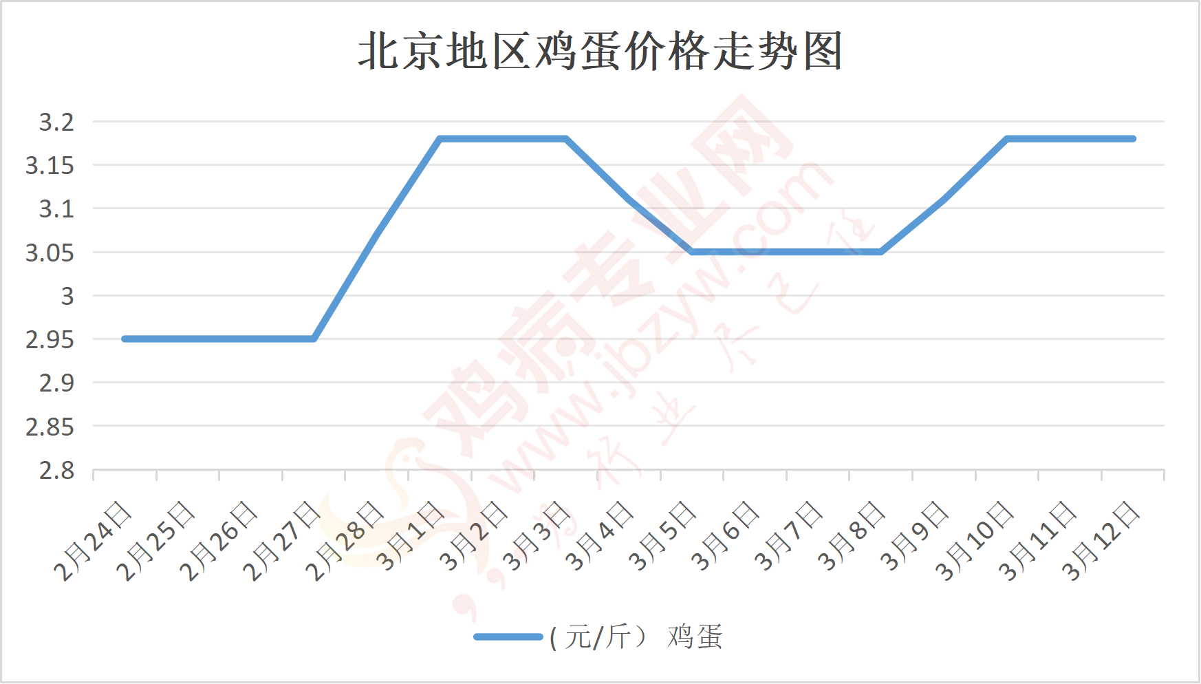 鸡病专业网消息:3月12日,北京各大市场鸡蛋价格维持稳定,主流参考价140元/44斤,石门,新发地、回龙观等主流批发价140元/44斤,稳;大洋路鸡蛋主流批发价格140元/44斤,稳,按质高低价均有,到车1台,到货正常,成交灵活,走货一般。