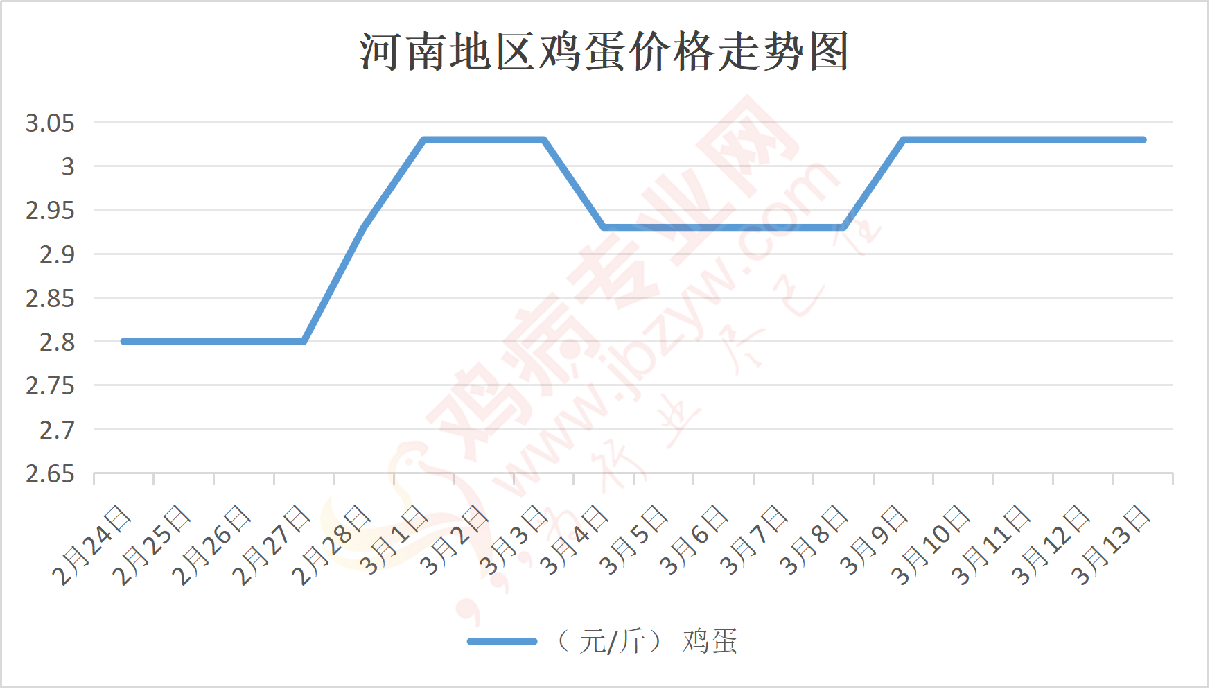鸡病专业网消息:3月13日,河南郑州鸡蛋3.05元/斤,稳;新密鸡蛋3.05元/斤,稳;荥阳鸡蛋3.05元/斤,稳;中牟鸡蛋3.05元/斤,稳;周口鸡蛋3元/斤,稳;商丘鸡蛋91元/30斤,稳;鹤壁鸡蛋3.05元/斤,稳;汝州鸡蛋3元/斤,稳;开封鸡蛋91元/30斤,稳;漯河鸡蛋3元/斤,稳;漯河临颍鸡蛋3元/斤,稳;许昌鸡蛋3元/斤,稳;南阳鸡蛋3元/斤,稳;南阳邓州鸡蛋3元/斤,稳;新乡鸡蛋3元/斤,稳;安阳鸡蛋3元/斤,稳;新郑鸡蛋3.05元/斤,稳;登封鸡蛋3.05元/斤,稳;平顶山鸡蛋3元/斤,稳;驻马店鸡蛋3元/斤,稳;三门峡鸡蛋3元/斤,稳;焦作鸡蛋3元/斤,稳;信阳鸡蛋3元/斤,稳;濮阳鸡蛋3元/斤,稳。