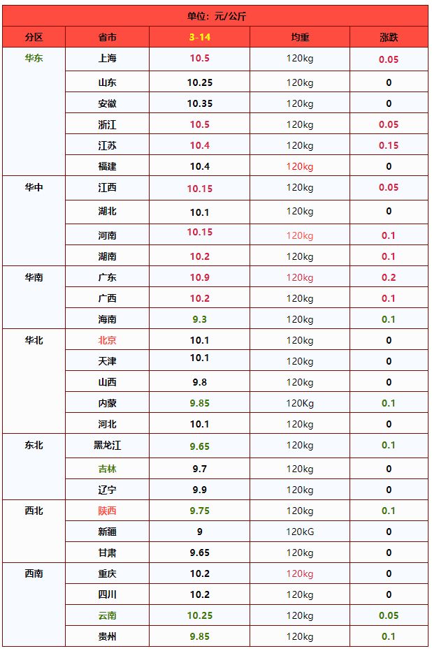 全国南北各省区生猪价格一览表