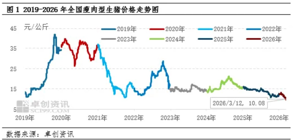 2026年生猪供应量持续增加,因此生猪价格呈现主线下滑态势。而3月份供应增加,但需求处于淡季低位水平,供大于求态势与1-2月上半月相比更为明显,猪价跌至低位水平。根据卓创资讯监测,2026年3月12日全国瘦肉型生猪交易均价10.08元/公斤,为2019年以来的最低点;此前2018年5月份出现的9.92元/公斤为近15年内的最低价,当前猪价与该价格仅相差0.16元/公斤。
