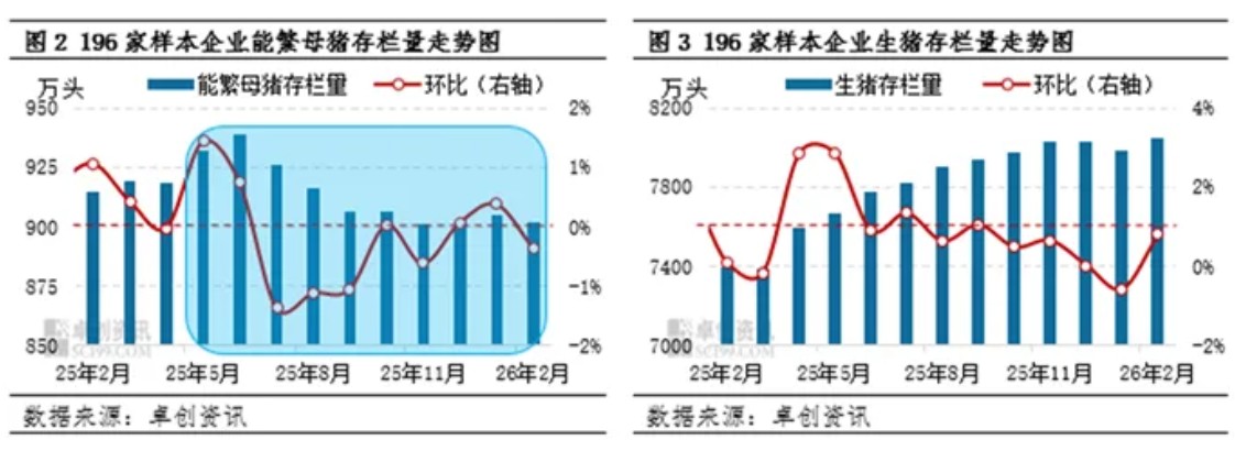 生猪价格下降最直接最根本的原因往往是生猪出栏量,而生猪出栏量则直接受能繁母猪存栏量及生猪存栏量影响。根据卓创资讯监测的196家中大型样本企业存出栏数据显示,2025年能繁母猪存栏量呈先增后减再盘整态势,2026年3-12月份生猪理论出栏量对应2025年5月份-2026年2月份的能繁母猪存栏量,2025年5-6月份能繁母猪存栏量增加,7-9月份回落,此后跌势暂止,对应2026年3-4月份生猪理论出栏量增加、5-7月份理论出栏量减少、此后主线稳定。2026年2月份样本企业能繁母猪存栏量与2025年6月份高点相比仅下滑3.95%,仍未触及去产能的目标。