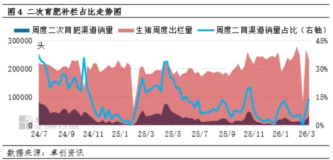 另外,近两年较为频繁的短线二次育肥操作亦是市场行情的不确定因素。根据卓创资讯数据统计,3月上旬养殖端流向二次育肥渠道的生猪数量仅占13.69%,对行情的支撑力度不足。而就过去两年的经验来看,短周期二次育肥补栏会对猪价形成支撑作用、出栏时则利空猪价。随着限制二次育肥补栏政策的持续实施以及养殖户更加趋于理性的思维出现,二次育肥对行情的影响程度或进一步减弱。