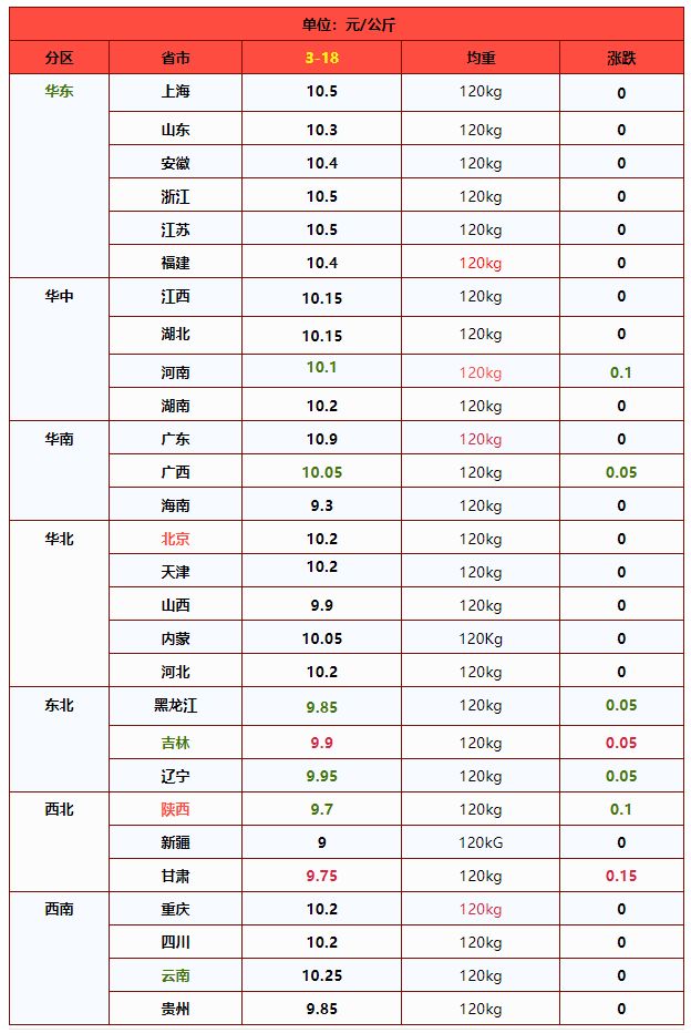 | 东北 | 辽宁省 | 9.52 | 9.48 | 0.42% | 元/KG |