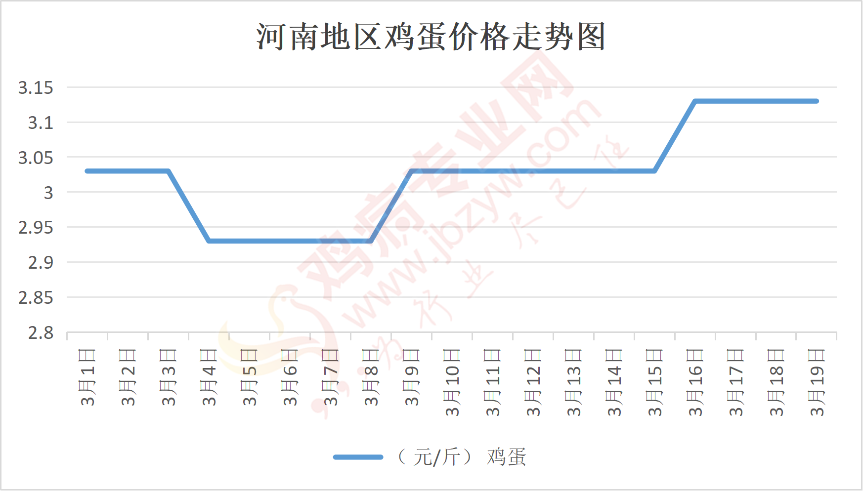 鸡病专业网消息:3月19日,河南郑州鸡蛋3.15元/斤,稳;新密鸡蛋3.15元/斤,稳;荥阳鸡蛋3.15元/斤,稳;中牟鸡蛋3.15元/斤,稳;周口鸡蛋3.1元/斤,稳;商丘鸡蛋93元/30斤,稳;鹤壁鸡蛋3.15元/斤,稳;汝州鸡蛋3.1元/斤,稳;开封鸡蛋93元/30斤,稳;漯河鸡蛋3.1元/斤,稳;漯河临颍鸡蛋3.1元/斤,稳;许昌鸡蛋3.1元/斤,稳;南阳鸡蛋3.1元/斤,稳;南阳邓州鸡蛋3.1元/斤,稳;新乡鸡蛋3.1元/斤,稳;安阳鸡蛋3.1元/斤,稳;新郑鸡蛋3.15元/斤,稳;登封鸡蛋3.15元/斤,稳;平顶山鸡蛋3.1元/斤,稳;驻马店鸡蛋3.1元/斤,稳;三门峡鸡蛋3.1元/斤,稳;焦作鸡蛋3.1元/斤,稳;信阳鸡蛋3.1元/斤,稳;濮阳鸡蛋3.1元/斤,稳。