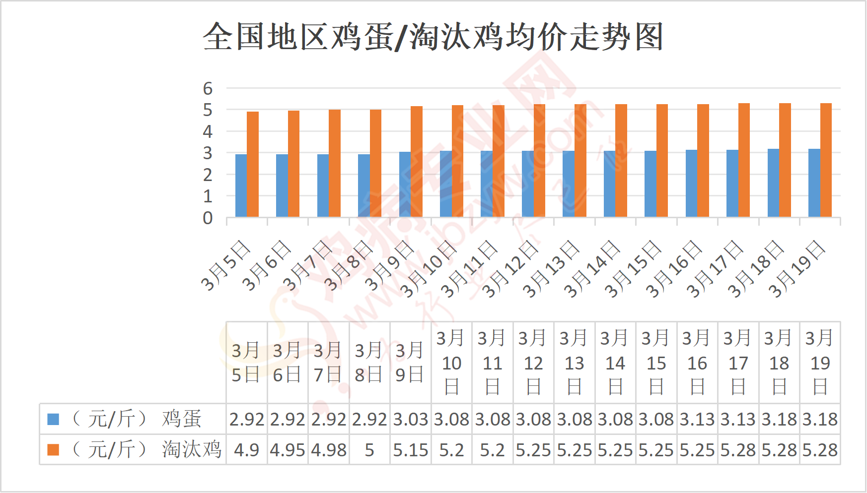 安徽地区:蚌埠鸡蛋3.1-3.17元/斤,与昨日相比持平,淘汰鸡5.4元/斤;