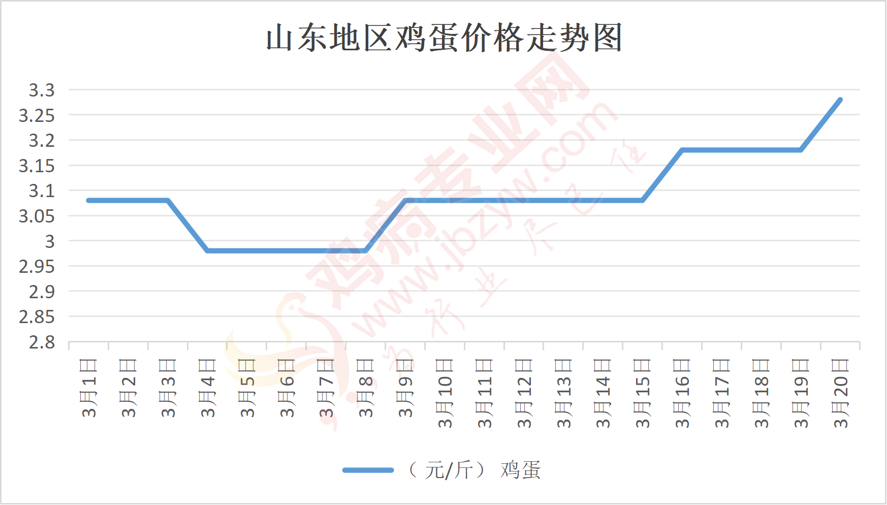 鸡病专业网消息:3月20日,山东地区莱阳鸡蛋3.3元/斤,涨;青岛鸡蛋3.3元/斤,涨;诸城鸡蛋3.35元/斤,涨;安丘鸡蛋3.2元/斤,涨;昌乐鸡蛋3.2元/斤,涨;寿光鸡蛋3.2元/斤,涨;昌邑鸡蛋3.2元/斤,涨;高密鸡蛋3.35元/斤,涨;青州鸡蛋3.2元/斤,涨;临朐鸡蛋3.2元/斤,涨;莱州鸡蛋3.3元/斤,涨;威海鸡蛋3.3元/斤,涨;临沭鸡蛋3.2元/斤,涨;沂水鸡蛋3.2元/斤,涨;沂南鸡蛋3.2元/斤,涨;莒南鸡蛋3.2元/斤,涨;兰陵县鸡蛋3.2元/斤,涨;日照鸡蛋3.2元/斤,涨;莒县鸡蛋3.2元/斤,涨;日照辛萁商贸鸡蛋3.2元/斤,涨;泗水鸡蛋价格96元/30斤,涨;济宁、汶上鸡蛋价格96元/30斤,涨;梁山、东平红蛋价格96元/30斤,涨;枣庄滕州地区鸡蛋混码主流到户97元/30斤,涨;泰安地区新泰鸡蛋价格96元/30斤,涨;菏泽地区曹县主流到户96元/30斤,涨;成武鸡蛋价格96元/30斤,涨;单县到户96元/30斤,涨;聊城莘县95元/30斤,涨;莱芜鸡蛋144元/45斤,涨;济南鸡蛋144元/45斤,涨;德州鸡蛋126元/40斤,涨;滨州鸡蛋126元/40斤,涨。