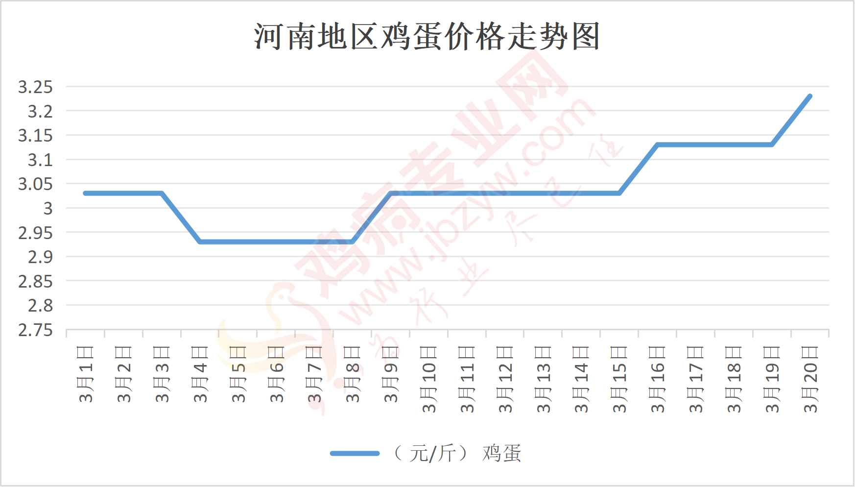 鸡病专业网消息:3月20日,河南郑州鸡蛋3.25元/斤,涨;新密鸡蛋3.25元/斤,涨;荥阳鸡蛋3.25元/斤,涨;中牟鸡蛋3.25元/斤,涨;周口鸡蛋3.2元/斤,涨;商丘鸡蛋96元/30斤,涨;鹤壁鸡蛋3.25元/斤,涨;汝州鸡蛋3.2元/斤,涨;开封鸡蛋96元/30斤,涨;漯河鸡蛋3.2元/斤,涨;漯河临颍鸡蛋3.2元/斤,涨;许昌鸡蛋3.2元/斤,涨;南阳鸡蛋3.2元/斤,涨;南阳邓州鸡蛋3.2元/斤,涨;新乡鸡蛋3.2元/斤,涨;安阳鸡蛋3.2元/斤,涨;新郑鸡蛋3.25元/斤,涨;登封鸡蛋3.25元/斤,涨;平顶山鸡蛋3.2元/斤,涨;驻马店鸡蛋3.2元/斤,涨;三门峡鸡蛋3.2元/斤,涨;焦作鸡蛋3.2元/斤,涨;信阳鸡蛋3.2元/斤,涨;濮阳鸡蛋3.2元/斤,涨。