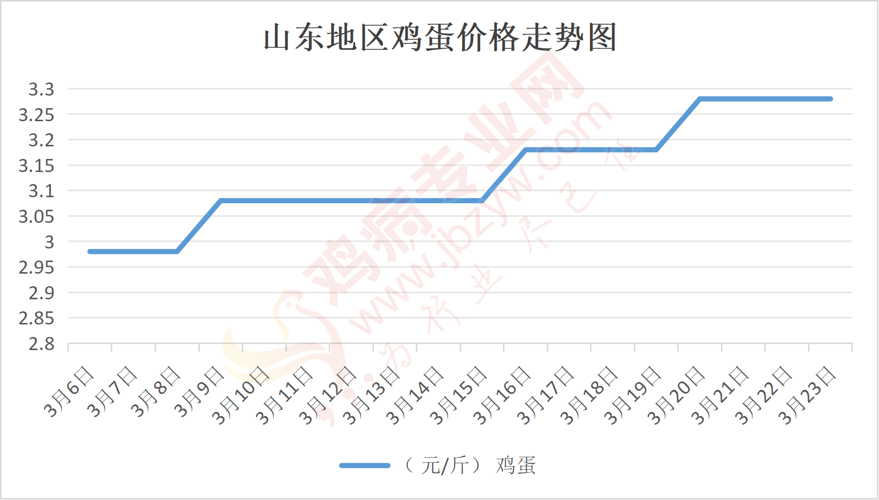 鸡病专业网消息:3月23日,山东地区莱阳鸡蛋3.3元/斤,稳;青岛鸡蛋3.3元/斤,稳;诸城鸡蛋3.35元/斤,稳;安丘鸡蛋3.2元/斤,稳;昌乐鸡蛋3.2元/斤,稳;寿光鸡蛋3.2元/斤,稳;昌邑鸡蛋3.2元/斤,稳;高密鸡蛋3.35元/斤,稳;青州鸡蛋3.2元/斤,稳;临朐鸡蛋3.2元/斤,稳;莱州鸡蛋3.3元/斤,稳;威海鸡蛋3.3元/斤,稳;临沭鸡蛋3.2元/斤,稳;沂水鸡蛋3.2元/斤,稳;沂南鸡蛋3.2元/斤,稳;莒南鸡蛋3.2元/斤,稳;兰陵县鸡蛋3.2元/斤,稳;日照鸡蛋3.2元/斤,稳;莒县鸡蛋3.2元/斤,稳;日照辛萁商贸鸡蛋3.2元/斤,稳;泗水鸡蛋价格96元/30斤,稳;济宁、汶上鸡蛋价格96元/30斤,稳;梁山、东平红蛋价格96元/30斤,稳;枣庄滕州地区鸡蛋混码主流到户97元/30斤,稳;泰安地区新泰鸡蛋价格96元/30斤,稳;菏泽地区曹县主流到户96元/30斤,稳;成武鸡蛋价格96元/30斤,稳;单县到户96元/30斤,稳;聊城莘县95元/30斤,稳;莱芜鸡蛋144元/45斤,稳;济南鸡蛋144元/45斤,稳;德州鸡蛋126元/40斤,稳;滨州鸡蛋126元/40斤,稳。