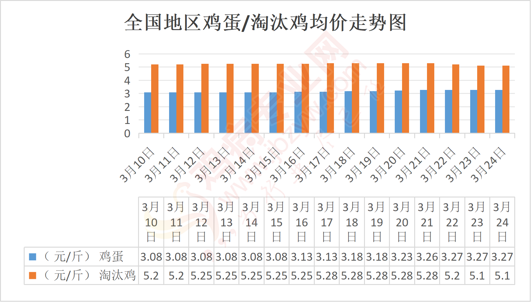 江苏地区:盐城东台红蛋散筐大码3.27-3.3元/斤,与昨日相比持平,淘汰鸡5.5元/斤;