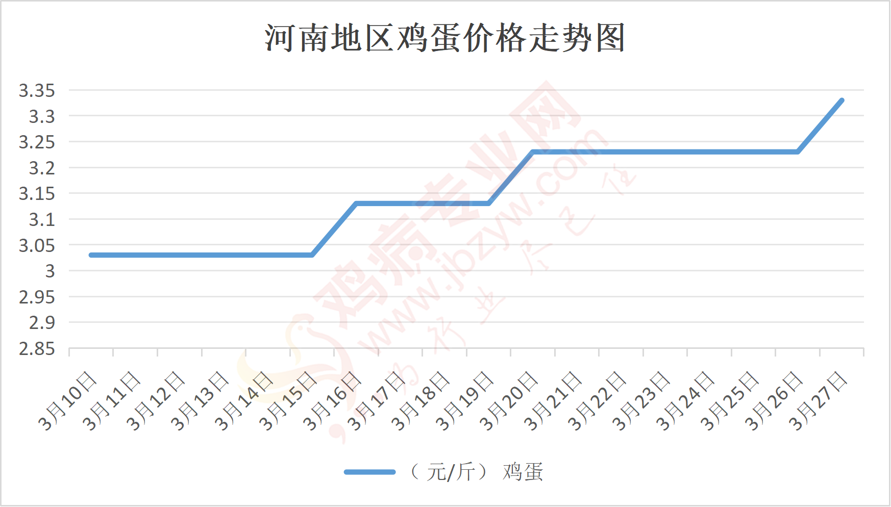 鸡病专业网消息:3月27日,河南郑州鸡蛋3.35元/斤,涨;新密鸡蛋3.35元/斤,涨;荥阳鸡蛋3.35元/斤,涨;中牟鸡蛋3.35元/斤,涨;周口鸡蛋3.3元/斤,涨;商丘鸡蛋99元/30斤,涨;鹤壁鸡蛋3.35元/斤,涨;汝州鸡蛋3.3元/斤,涨;开封鸡蛋99元/30斤,涨;漯河鸡蛋3.3元/斤,涨;漯河临颍鸡蛋3.3元/斤,涨;许昌鸡蛋3.3元/斤,涨;南阳鸡蛋3.3元/斤,涨;南阳邓州鸡蛋3.3元/斤,涨;新乡鸡蛋3.3元/斤,涨;安阳鸡蛋3.3元/斤,涨;新郑鸡蛋3.35元/斤,涨;登封鸡蛋3.35元/斤,涨;平顶山鸡蛋3.3元/斤,涨;驻马店鸡蛋3.3元/斤,涨;三门峡鸡蛋3.3元/斤,涨;焦作鸡蛋3.3元/斤,涨;信阳鸡蛋3.3元/斤,涨;濮阳鸡蛋3.3元/斤,涨。