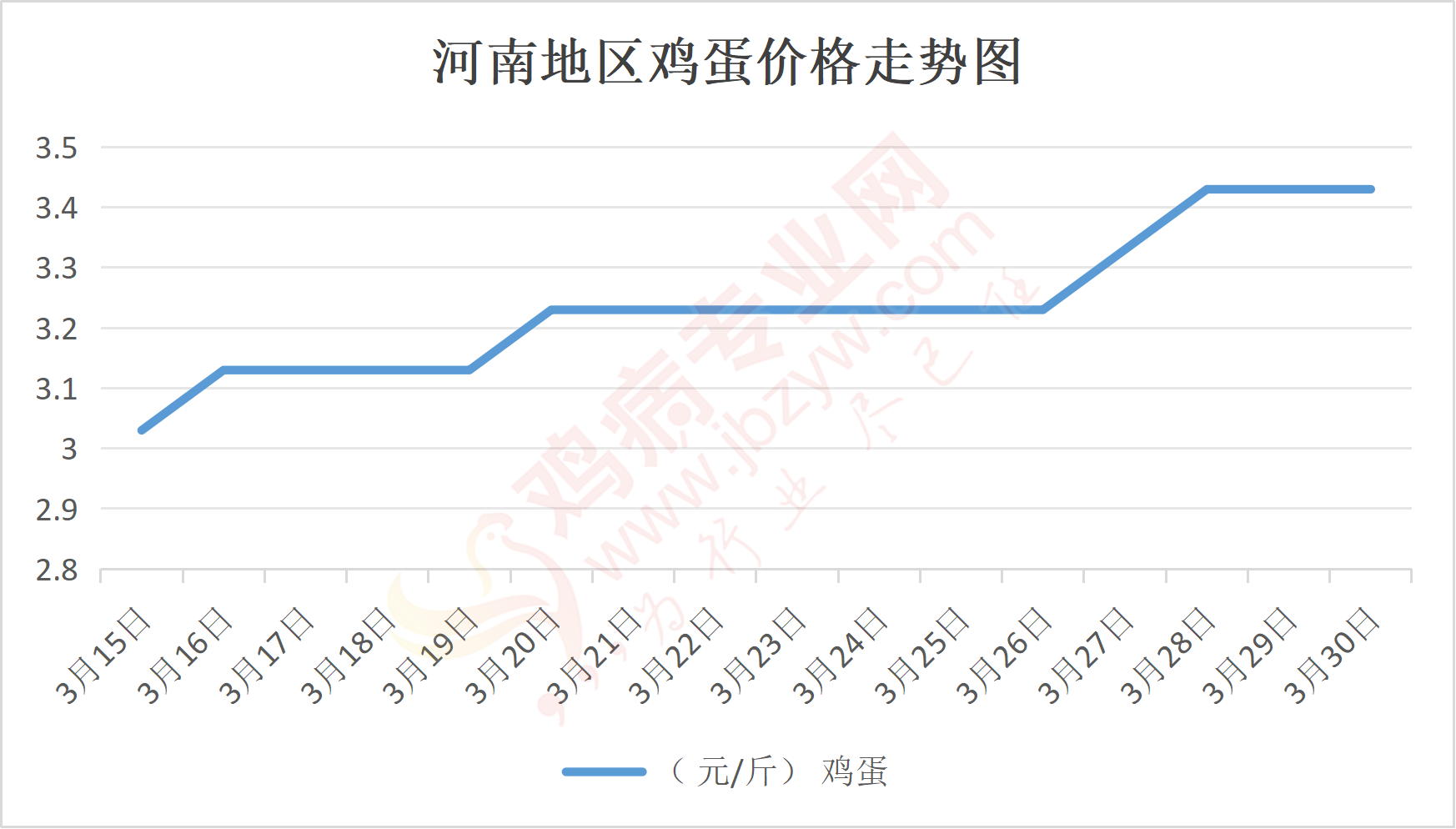 鸡病专业网消息:3月30日,河南郑州鸡蛋3.45元/斤,稳;新密鸡蛋3.45元/斤,稳;荥阳鸡蛋3.45元/斤,稳;中牟鸡蛋3.45元/斤,稳;周口鸡蛋3.4元/斤,稳;商丘鸡蛋102元/30斤,稳;鹤壁鸡蛋3.45元/斤,稳;汝州鸡蛋3.4元/斤,稳;开封鸡蛋102元/30斤,稳;漯河鸡蛋3.4元/斤,稳;漯河临颍鸡蛋3.4元/斤,稳;许昌鸡蛋3.4元/斤,稳;南阳鸡蛋3.4元/斤,稳;南阳邓州鸡蛋3.4元/斤,稳;新乡鸡蛋3.4元/斤,稳;安阳鸡蛋3.4元/斤,稳;新郑鸡蛋3.45元/斤,稳;登封鸡蛋3.45元/斤,稳;平顶山鸡蛋3.4元/斤,稳;驻马店鸡蛋3.4元/斤,稳;三门峡鸡蛋3.4元/斤,稳;焦作鸡蛋3.4元/斤,稳;信阳鸡蛋3.4元/斤,稳;濮阳鸡蛋3.4元/斤,稳。