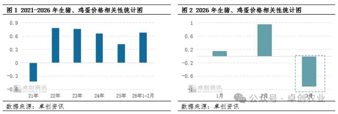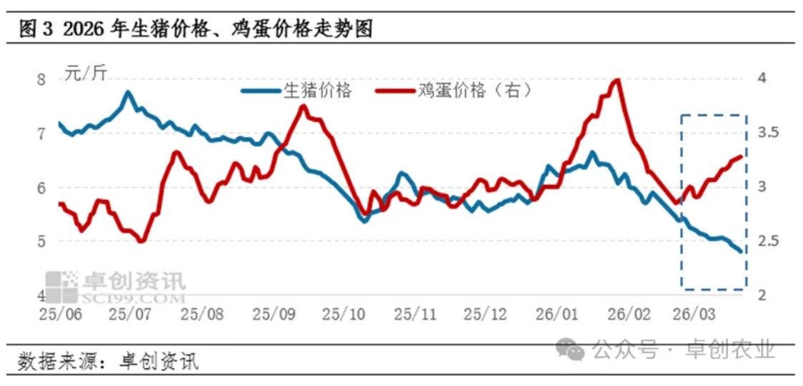 3月份生猪与鸡蛋价格呈高度负相关关系,鸡蛋价格的消费吸引力削弱