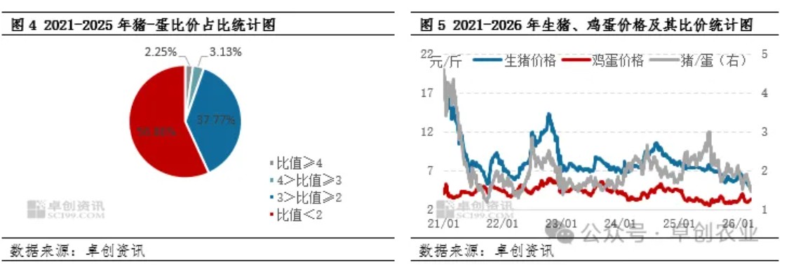 这一动态可以通过“猪-蛋比价”得到直观印证。根据历史数据分析,当比价大于2,且比值越高时,意味着鸡蛋在终端市场上相对于猪肉拥有显著的价格吸引力,从而对蛋价形成支撑;反之,当比价低于2,则支撑减弱甚至转为拖累。2021-2025年猪-蛋比价2以内的天数占比接近总天数的6成,这说明在长周期的多数时间,两者的绝对价差并未拉开到足以激发大规模、持续且方向稳定的消费替代的程度,价格更多由其他共同因素驱动。但短周期来看,2026年两者比值由年初2.07逐步降低至1.46,这就意味着当前同样的金额条件下,鸡蛋的价格优势在减弱。如果比值持续位于低位甚至继续下行,理论上或导致部分需求回流至猪肉,从而从消费端抑制蛋价的上涨动能。