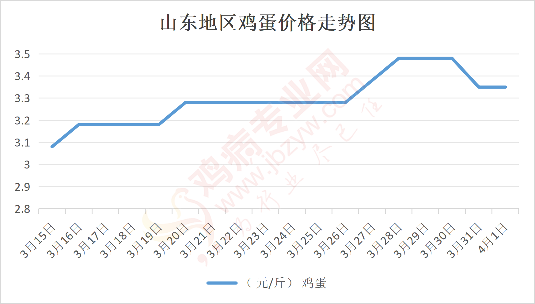 鸡病专业网消息:4月1日,山东地区莱阳鸡蛋3.35元/斤,稳;青岛鸡蛋3.35元/斤,稳;诸城鸡蛋3.4元/斤,稳;安丘鸡蛋3.25元/斤,稳;昌乐鸡蛋3.25元/斤,稳;寿光鸡蛋3.25元/斤,稳;昌邑鸡蛋3.25元/斤,稳;高密鸡蛋3.4元/斤,稳;青州鸡蛋3.25元/斤,稳;临朐鸡蛋3.25元/斤,稳;莱州鸡蛋3.35元/斤,稳;威海鸡蛋3.35元/斤,稳;临沭鸡蛋3.3元/斤,稳;沂水鸡蛋3.3元/斤,稳;沂南鸡蛋3.3元/斤,稳;莒南鸡蛋3.3元/斤,稳;兰陵县鸡蛋3.3元/斤,稳;日照鸡蛋3.3元/斤,稳;莒县鸡蛋3.3元/斤,稳;日照辛萁商贸鸡蛋3.3元/斤,稳;泗水鸡蛋价格96元/30斤,稳;济宁、汶上鸡蛋价格96元/30斤,稳;梁山、东平红蛋价格96元/30斤,稳;枣庄滕州地区鸡蛋混码主流到户98元/30斤,稳;泰安地区新泰鸡蛋价格96元/30斤,稳;菏泽地区曹县主流到户96元/30斤,稳;成武鸡蛋价格96元/30斤,稳;单县到户96元/30斤,稳;聊城莘县96元/30斤,稳;莱芜鸡蛋144元/45斤,稳;济南鸡蛋144元/45斤,稳;德州鸡蛋126元/40斤,稳;滨州鸡蛋126元/40斤,稳。