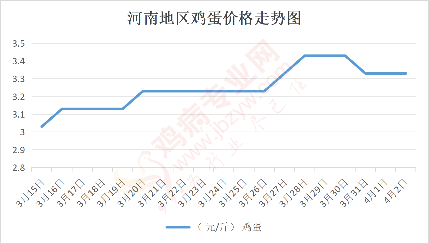 鸡病专业网消息:4月2日,河南郑州鸡蛋3.3元/斤,稳;新密鸡蛋3.3元/斤,稳;荥阳鸡蛋3.3元/斤,稳;中牟鸡蛋3.3元/斤,稳;周口鸡蛋3.25元/斤,稳;商丘鸡蛋97元/30斤,稳;鹤壁鸡蛋3.3元/斤,稳;汝州鸡蛋3.25元/斤,稳;开封鸡蛋97元/30斤,稳;漯河鸡蛋3.25元/斤,稳;漯河临颍鸡蛋3.25元/斤,稳;许昌鸡蛋3.25元/斤,稳;南阳鸡蛋3.25元/斤,稳;南阳邓州鸡蛋3.25元/斤,稳;新乡鸡蛋3.25元/斤,稳;安阳鸡蛋3.25元/斤,稳;新郑鸡蛋3.3元/斤,稳;登封鸡蛋3.3元/斤,稳;平顶山鸡蛋3.25元/斤,稳;驻马店鸡蛋3.25元/斤,稳;三门峡鸡蛋3.25元/斤,稳;焦作鸡蛋3.25元/斤,稳;信阳鸡蛋3.25元/斤,稳;濮阳鸡蛋3.25元/斤,稳。